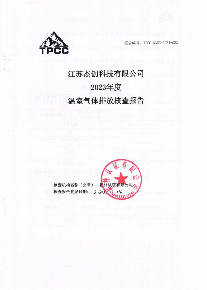 江蘇杰創科技有限公司2023年度溫室氣體排放核查報告及證書