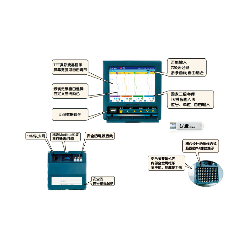 JC-XJ-9000中長(zhǎng)圖彩屏無(wú)紙記錄儀,40路萬(wàn)能輸入,可輸入標(biāo)準(zhǔn)電流、標(biāo)準(zhǔn)電壓、頻率、毫伏、熱電偶、熱電阻等信號(hào)。具有傳感器隔離···